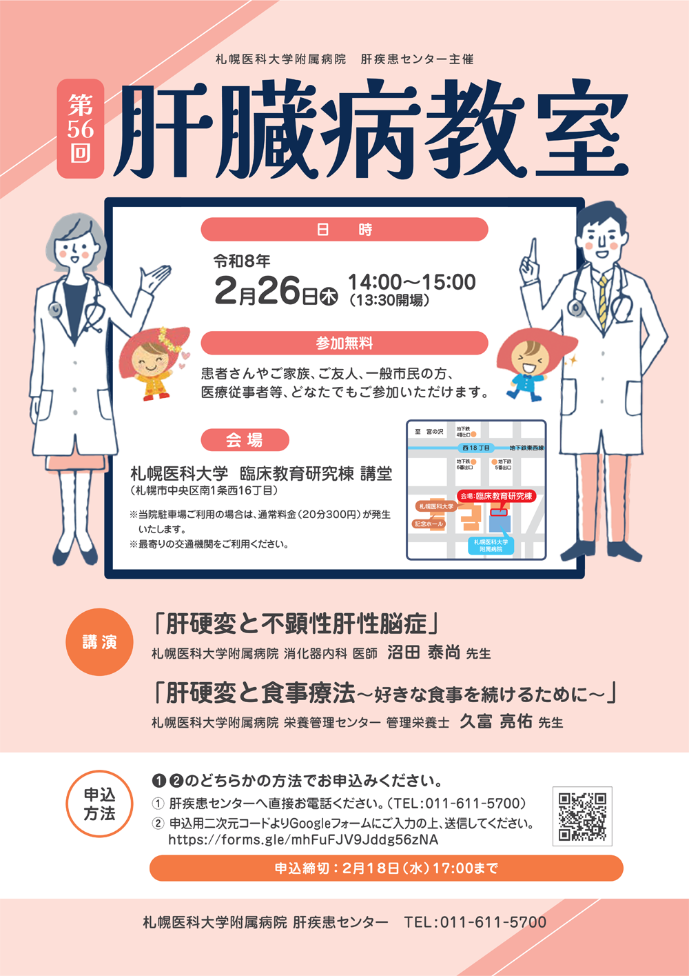 肝疾患センターへ直接お電話いただくか、下記URLまたはチラシのQRコードよりお申し込みください。 申込URL : https://forms.gle/mhFuFJV9Jddg56zNA申込締切 2月18日(水)17:00まで |