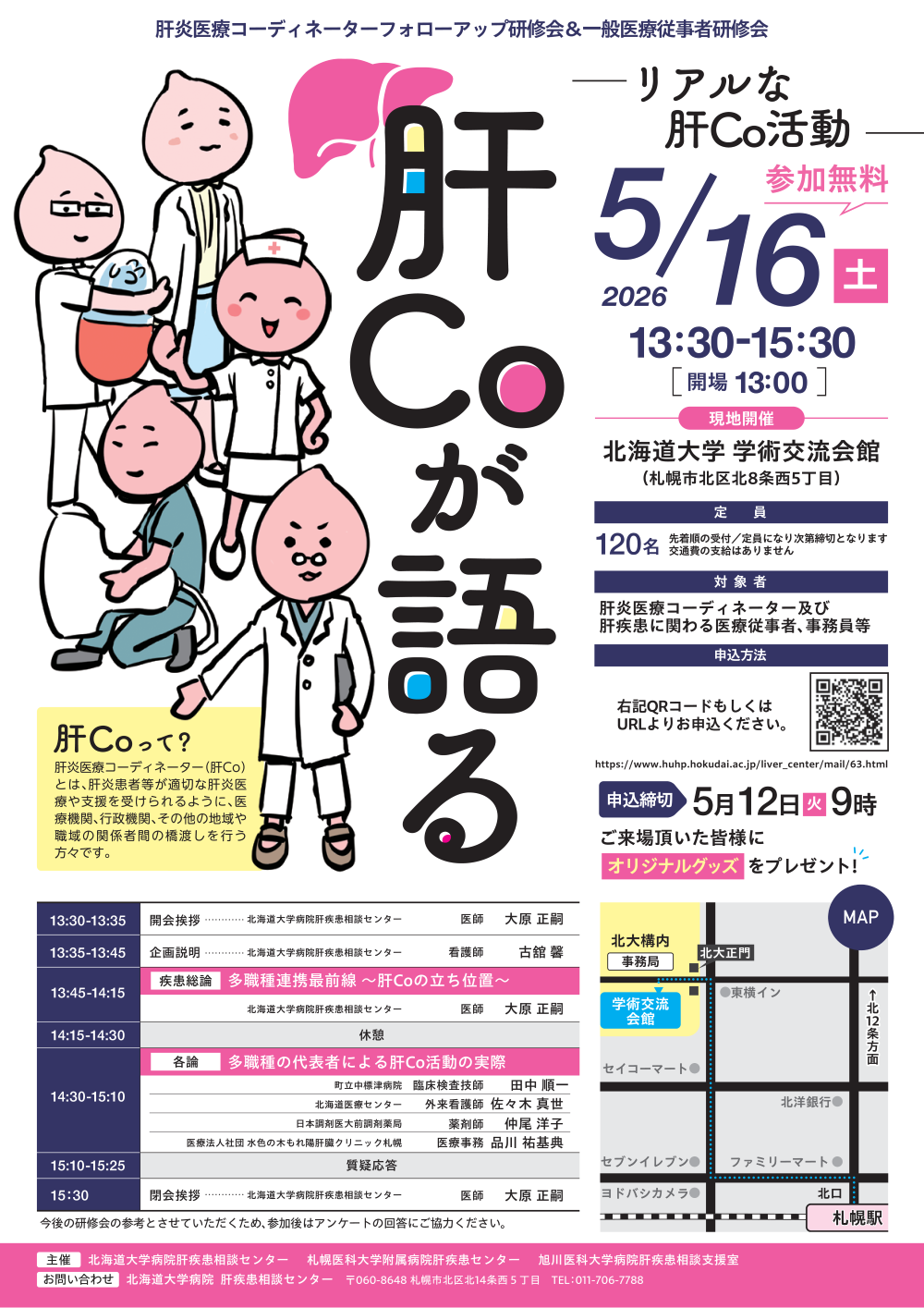ポスター内のQRコード、もしくは下記URLより事前登録をお願いします。 申込URL ▶ https://www.huhp.hokudai.ac.jp/liver_center/mail/63.html申込締切/5月12日(火)9時 |