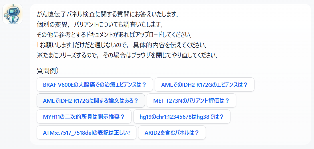 がん遺伝子パネル検査に関する様々な質問に答えてくれるAIチャットボットです.Varporterのファイルをアップロードすると,いろいろ調査してくれます.また個別の変異,バリアントの調査や論文検索,臨床試験情報の収集も行ってくれます.Varporter導入施設でお使いいただけます.下のボタンを押すとお試しいただけます.