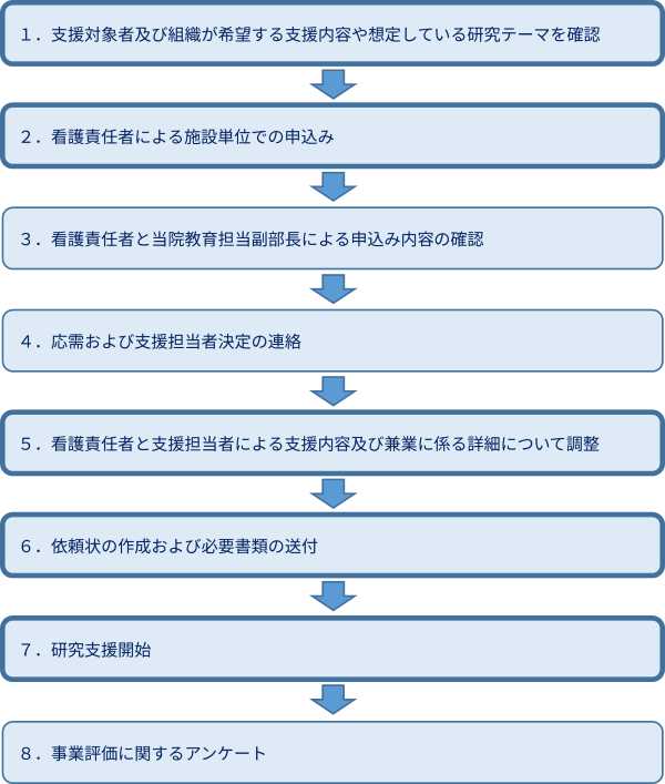 申込後、対象施設の看護責任者に連絡し、希望する支援内容等を共有させていただきます。その後、支援担当者を検討したうえで、申し込みの応需を連絡させていただきます。