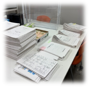 ◀毎年恒例の、たくさんの印刷物に囲まれる時期です。