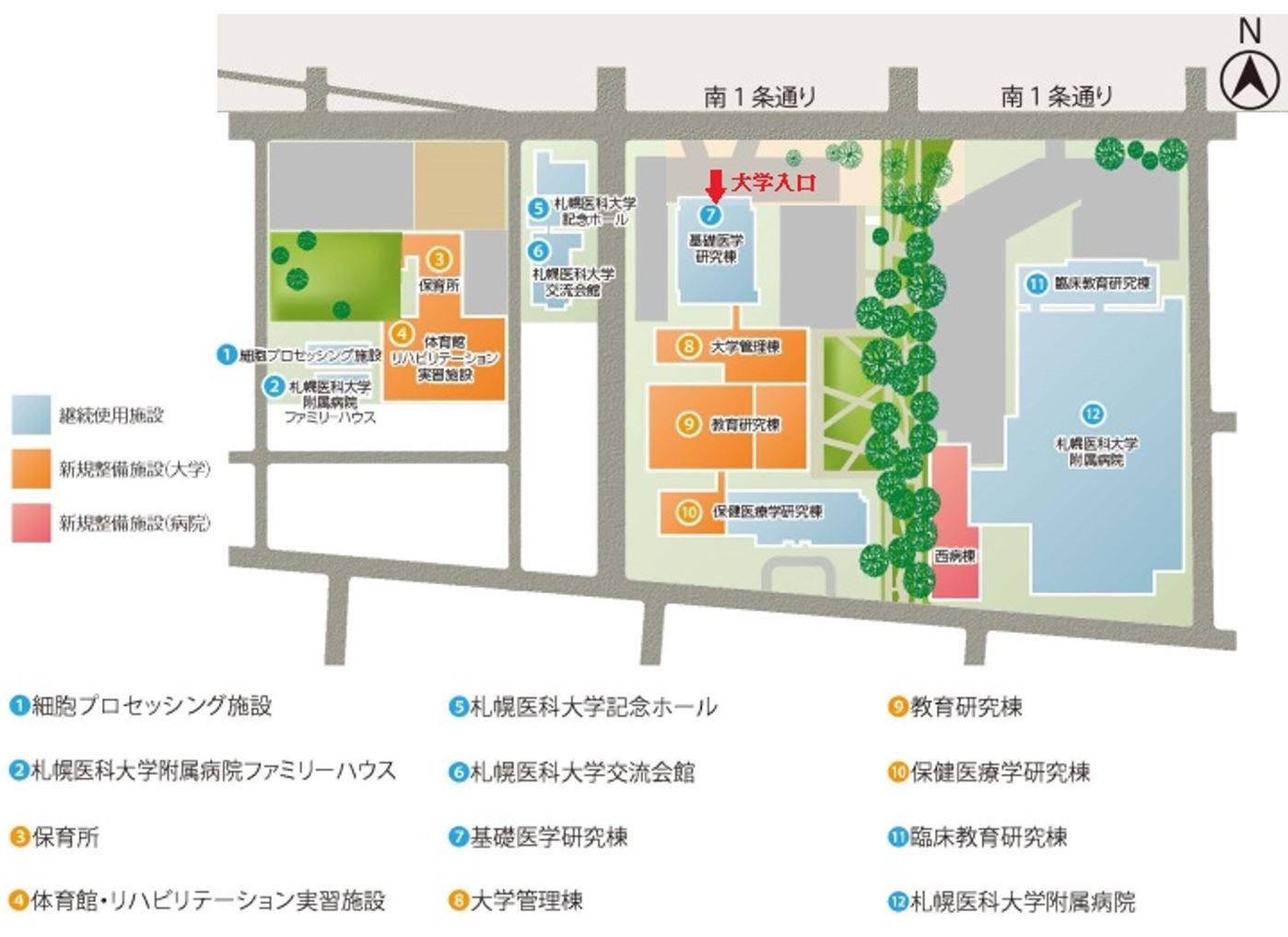 ◯スタートアップ・研究支援講座/先端医療知財学講座は基礎医学研究棟(図の⑦)の9Fです