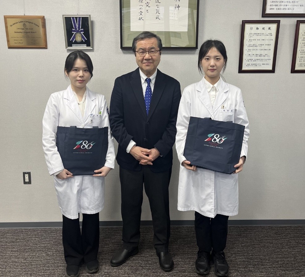 本学と国際交流協定を締結している韓国カトリック大学の学生さんが、2026年3月16日~31日、本学で臨床実習を行いました。今回来学したのは、Ok Dakyeong(オク・ダギョン)さんとJung Jiwon(チョン・ジウォン)さんで、いずれもカトリック大学医学部6年生です。3月30日には学長室に表敬訪問に来られました(写真1)。