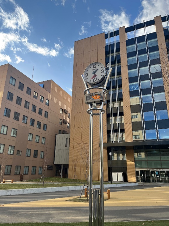 早いもので2025年も残すところあと1か月となりました。今年は、本学にとって創基80周年の記念すべき年でした。これまで様々な関連イベント・企画などを行ってきましたが、この度、記念事業の一環として、「アウトドアクロック」を広場「らてす」に設置しました(写真1,2)。教育研究棟や附属病院を利用する学生、教職員、患者さんの利便性に加え、記念モニュメントとしてのデザイン性にも優れたものとなりました。このアウトドアクロックは、創基80周年への寄付金により設置されたものです。あらためて、ご寄付いただいた多くの方々に心より感謝申し上げます。