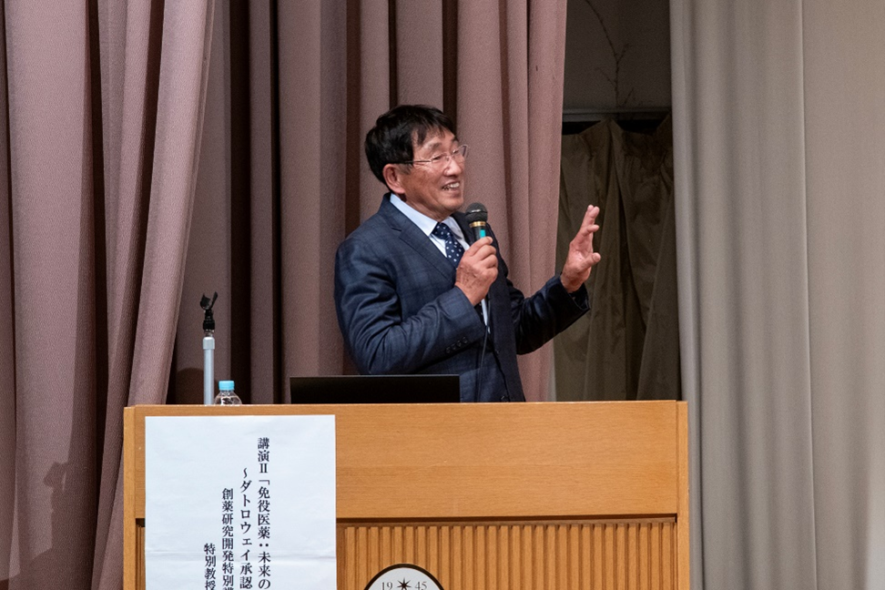 本講演会ではそれを記念して、濱田先生に「免疫医薬:将来の創薬に向けて ~ダトロウェイ®承認までの道筋~」と題してご講演いただきました(写真3)。また、附属研究連携機構長の本望 修教授(神経再生医療学部門)には「ステミラック注®の実用化」をテーマにお話いただきました(写真4)。座長は一宮慎吾教授(免疫制御医学部門、研究連携推進機構副機構長)に務めていただきました(写真5)。