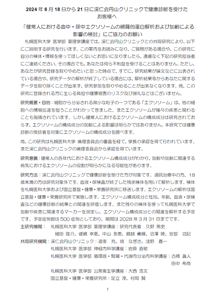 本研究は、2024年6月18日から21日に渓仁会円山クリニックで健康診断を受けた方を対象としております 。